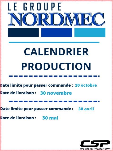 Voici le calendrier de production/livraison pour les vêtements du Groupe Nordmec. Pour toutes questions, vous pouvez communiquer avec nous à nos bureaux. 450 759-4674